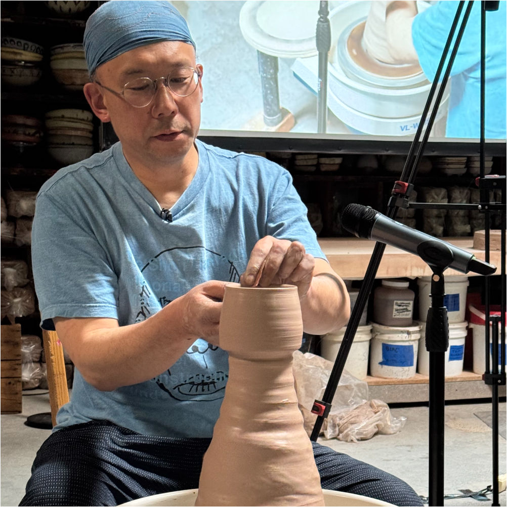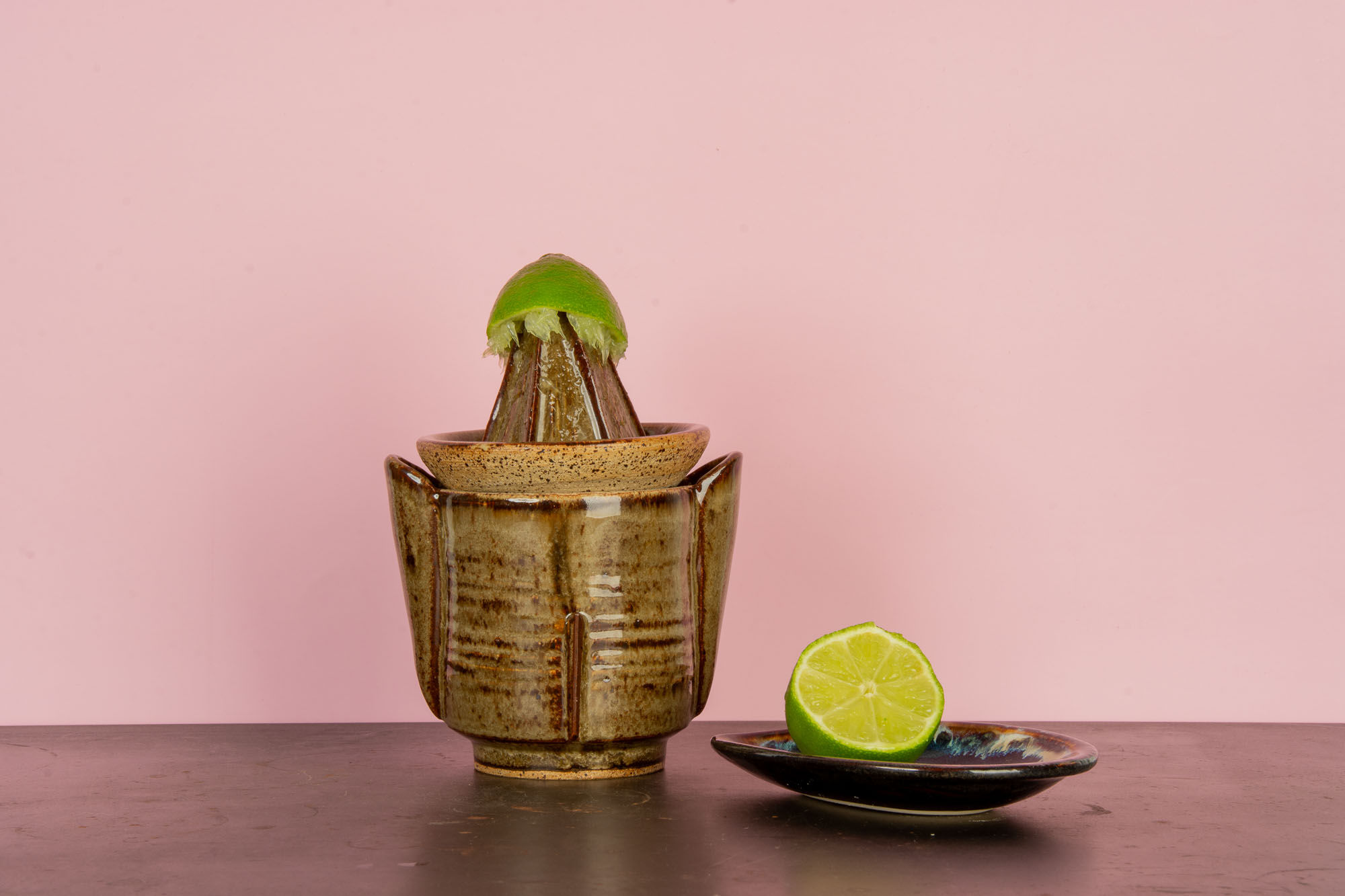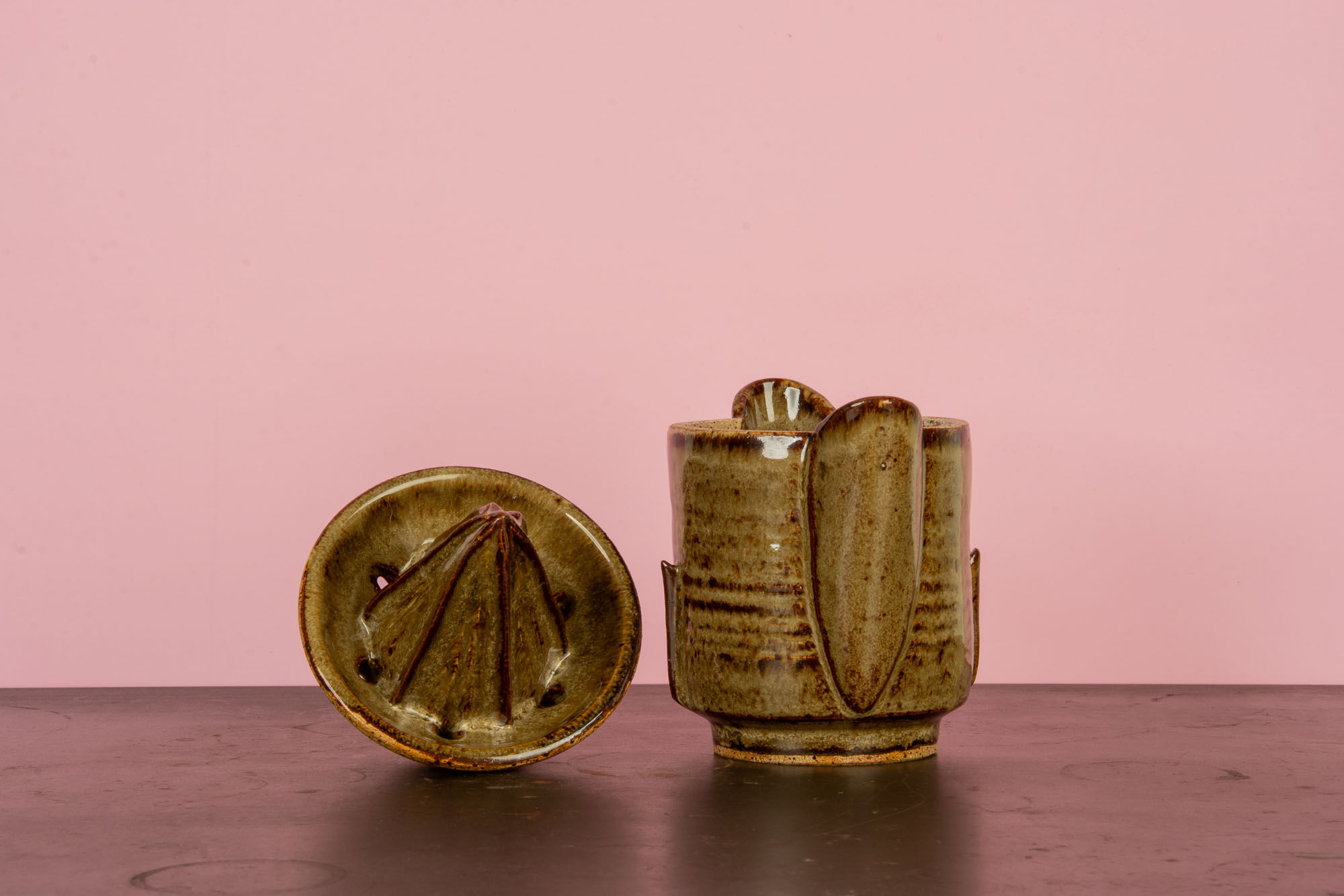 Some new ceramic work — a juicer and cup. This piece is a technically advanced form incorporating wheel throwing, slab handbuilding, carving, and coils. The cup could be nice for making salad dressings, and it juices nicely!