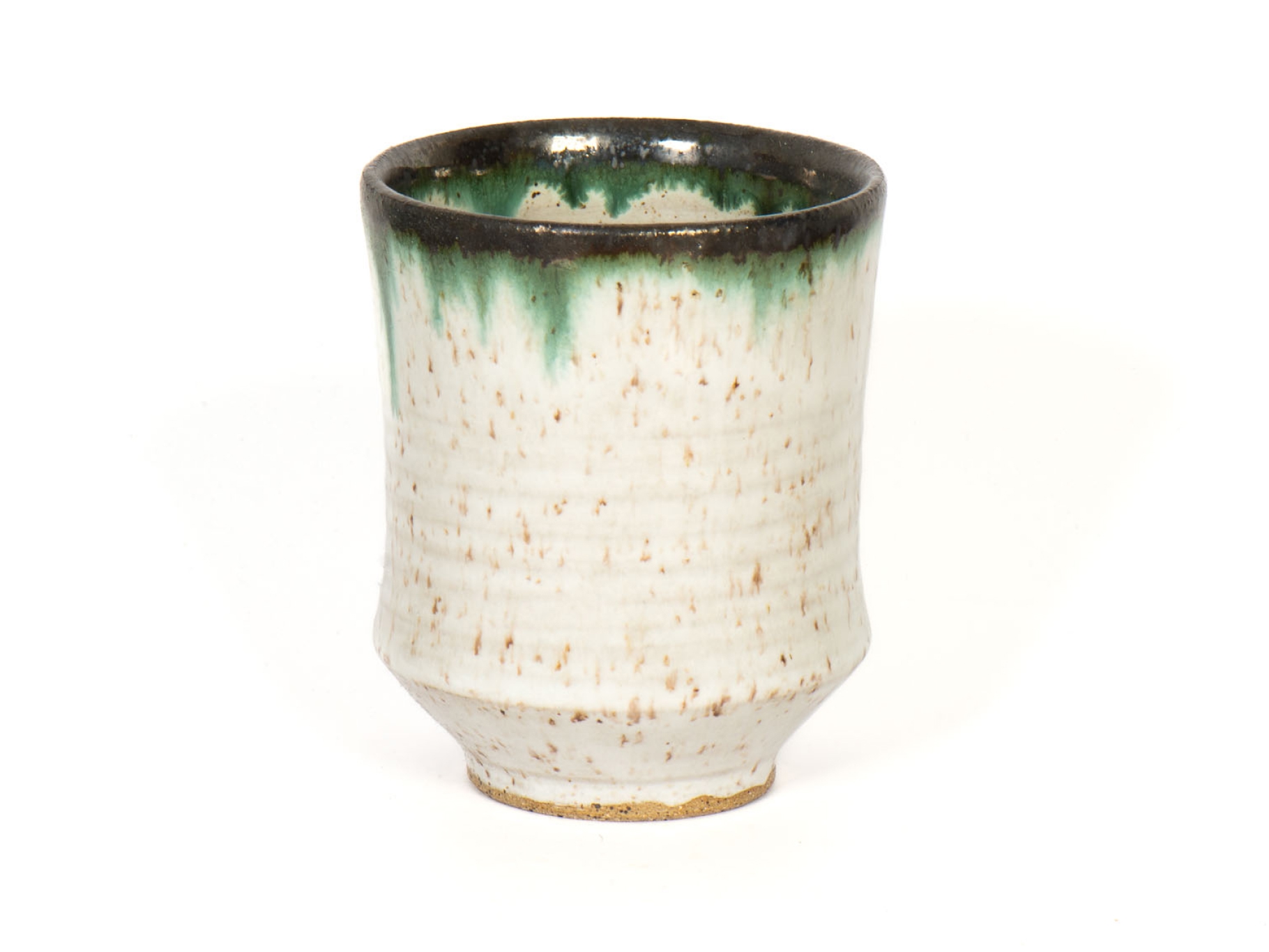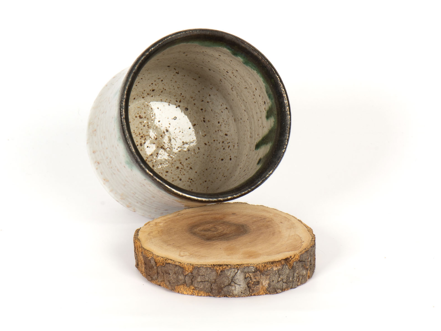 Glazed in a clean white finish and accented with a hand-brushed green copper wash around the rim, each cup carries subtle variation and depth. Wheel-thrown from durable stoneware, it’s made to be used daily — whether for drink or creative workspaces.