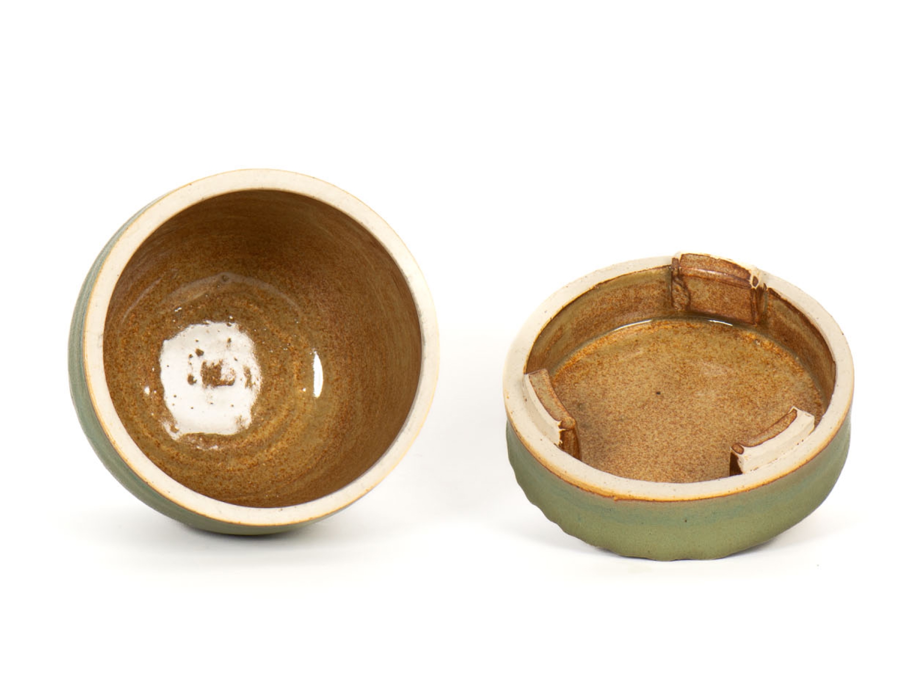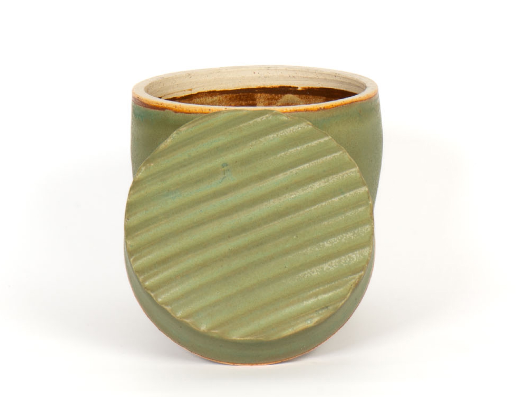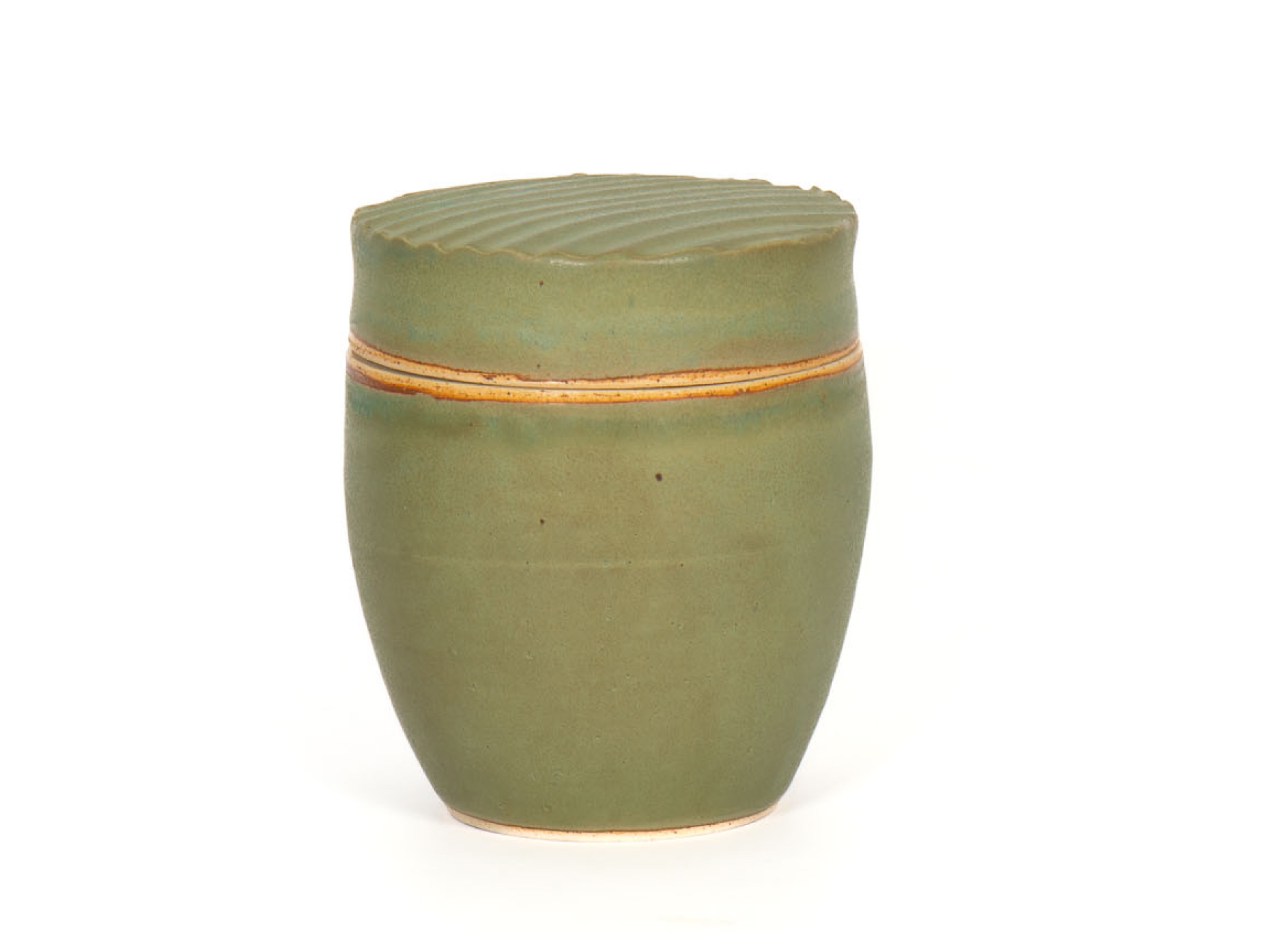 A textured ceramic lidded jar finished in a satin matte green glaze, offering a soft, earthy surface with subtle depth and variation.