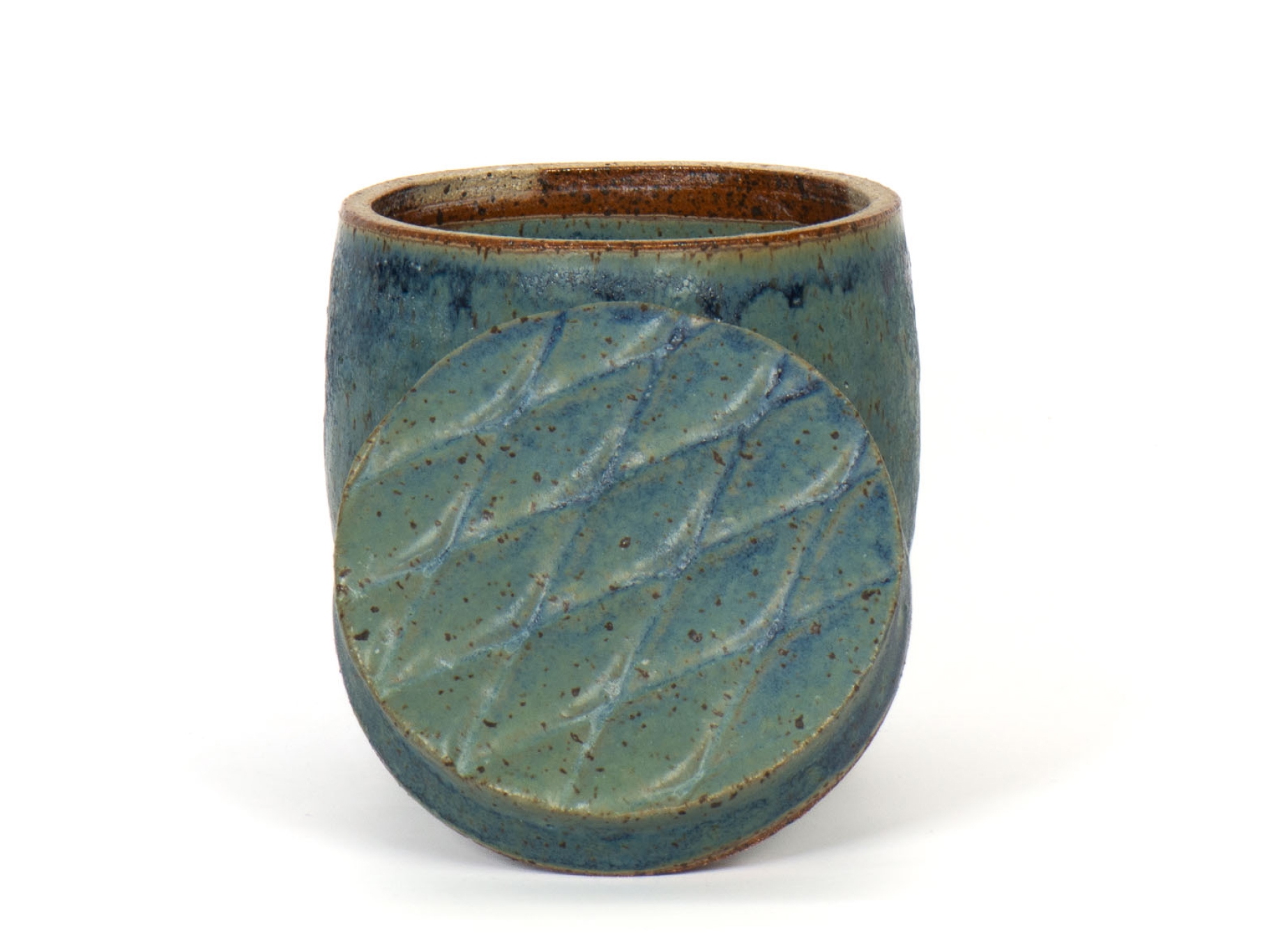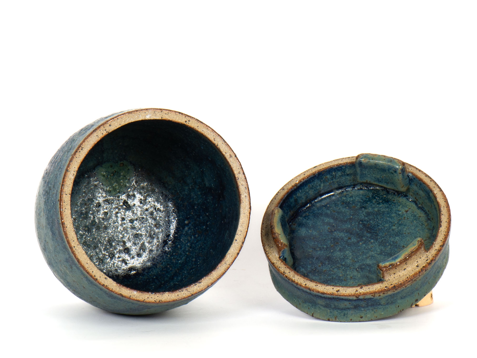A textured ceramic lidded jar finished in a satin cobalt blue glaze, offering a soft, earthy surface with subtle depth and variation.
